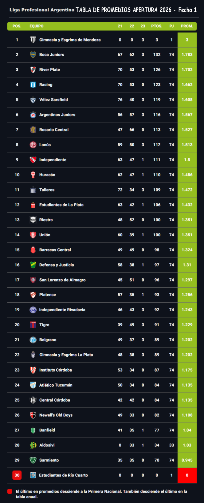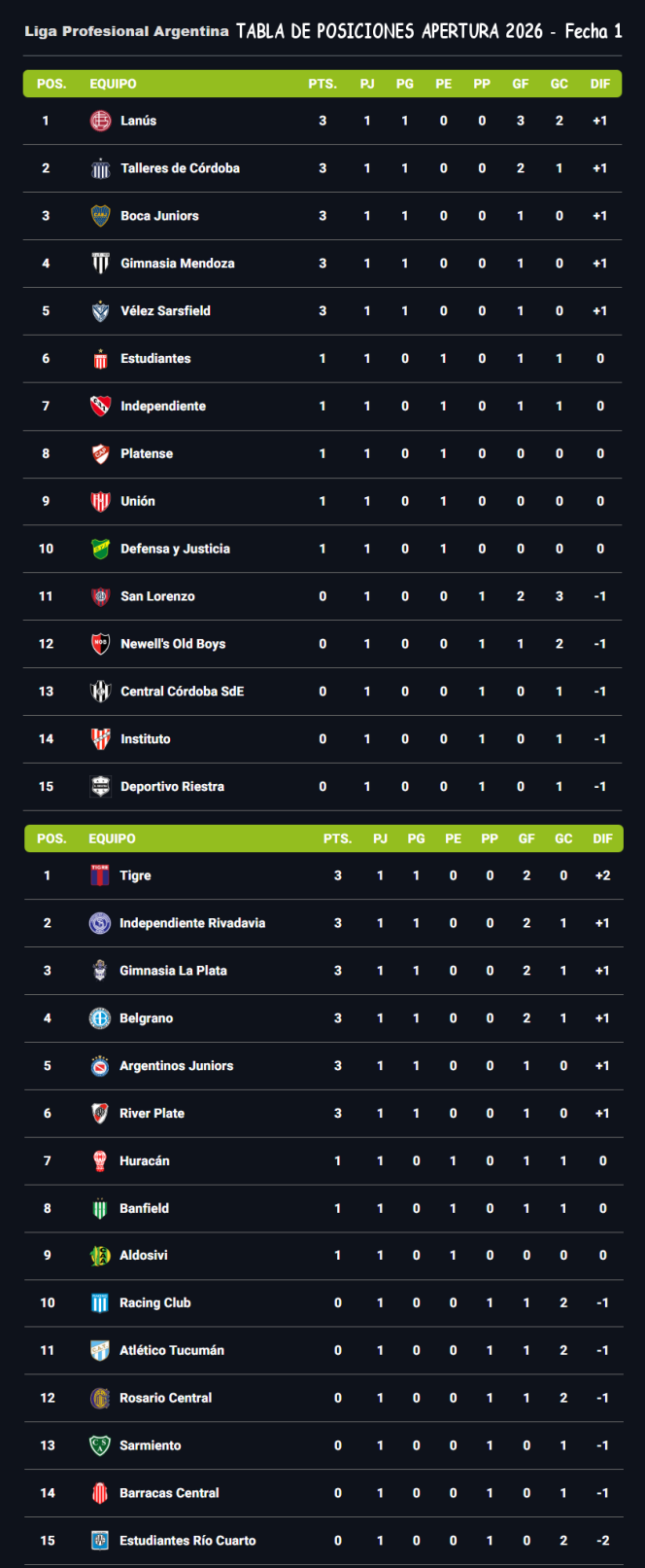 TABLAS TORNEO APERTURA MERCADO LIBRE 2026 - FECHA 1