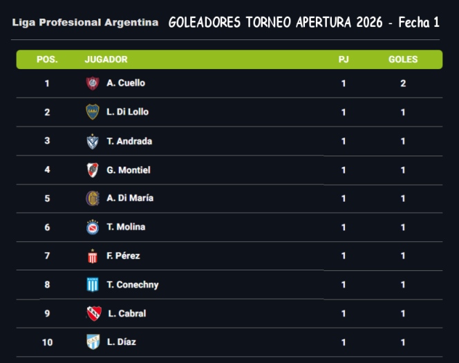 GOLEADORES DEL TORNEO DE LA LIGA PROFESIONAL DE FUTBOL - Fecha 1