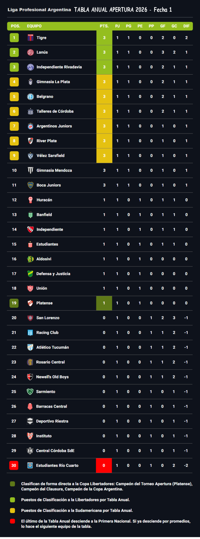 TABLAS TORNEO APERTURA MERCADO LIBRE 2026 - FECHA 1